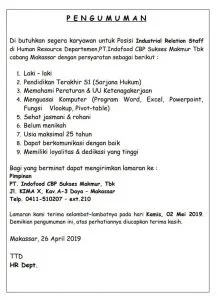 Loker PT Indofood CBP Sukses Makmur Tbk Makassar Mei 2019