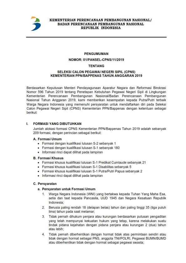 Lowongan CPNS Kementerian PPN/Bappenas (200 Formasi) Tahun 2019